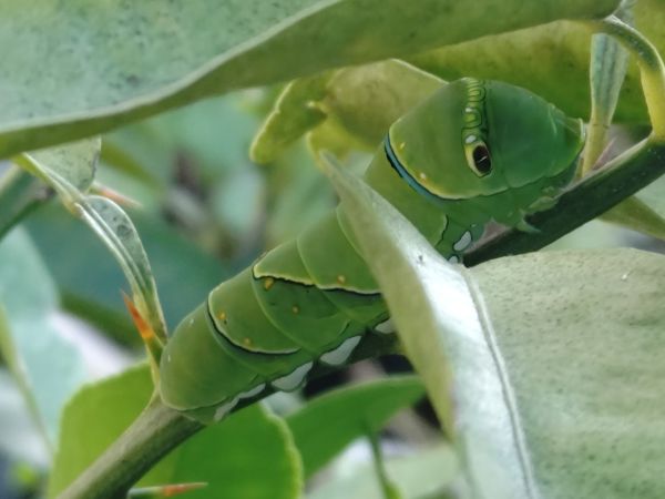 今朝、柚子の木を見ると元気なアオムシがムシャムシャと葉っぱを食べているのを発見。黒くなったものだけかと思ったらそうでもないよう。