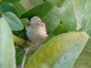 別の葉っぱにはカエルが鎮座しています。やってくる虫でも狙っているのでしょうか? 一本の柚子の木の中でもいろいろの命のドラマが展開されているようです。