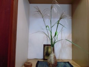 土手にのぼると河原にはススキが生えていました。ちょっともらっていこうと妻。友人に頂いた花瓶に入れて玄関に飾られていました。中秋の名月が近いらしい。