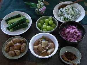 お昼は恒例の芋煮会。会員さんの畑でとれた里芋がトロトロでおいしい。アケビの煮物やモッテ菊など、カテモノ文化息づく米沢の秋の味覚を頂戴いたしました。
