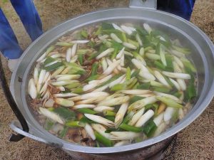 唐松観音下の川崎屋さんのテントでの芋煮会。設備の準備等一切をお任せでできるのは素人集団にとっては誠に有難いサービスといえます。