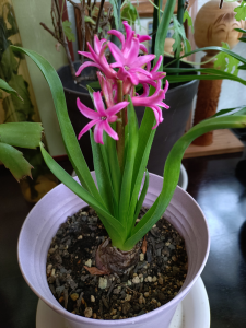 土に植えているので水栽培よりは条件がいいかと思ったのですが元の球根の養分が違うのでしょう。蔵王山頂に咲くこまくさをイメージさせるようなヒヤシンスの開花です。