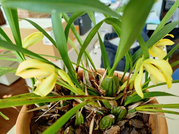 事務所のスチール棚の上に置かれている植物が黄色い花を咲かせてくれています。ランの仲間だと思うのですが名前は不明。