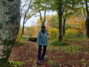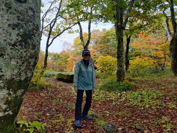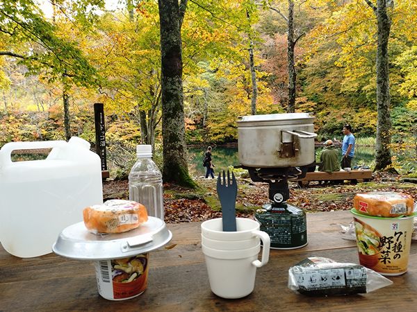 駐車場から数十メートルの靴デビュー。赤と黄に色づいたドッコ沼周辺の紅葉を眺めながらインスタント味噌汁で昼食をいただきました。