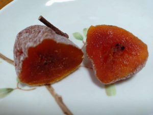 表面は薄い白粉でおおわれ、いかにもやわらかそう。切ってみると中がなめらかに完熟している感じ。我が家の干し柿とは全くの別物。