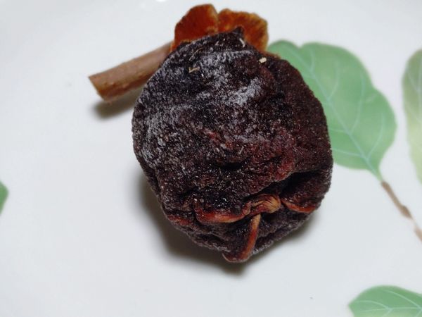 本日、自家製の干し柿も食べてみようかと一つを縄から取り外してみました。手触りがカチンコチン。先日頂いた干し柿とは全く違う感じ。